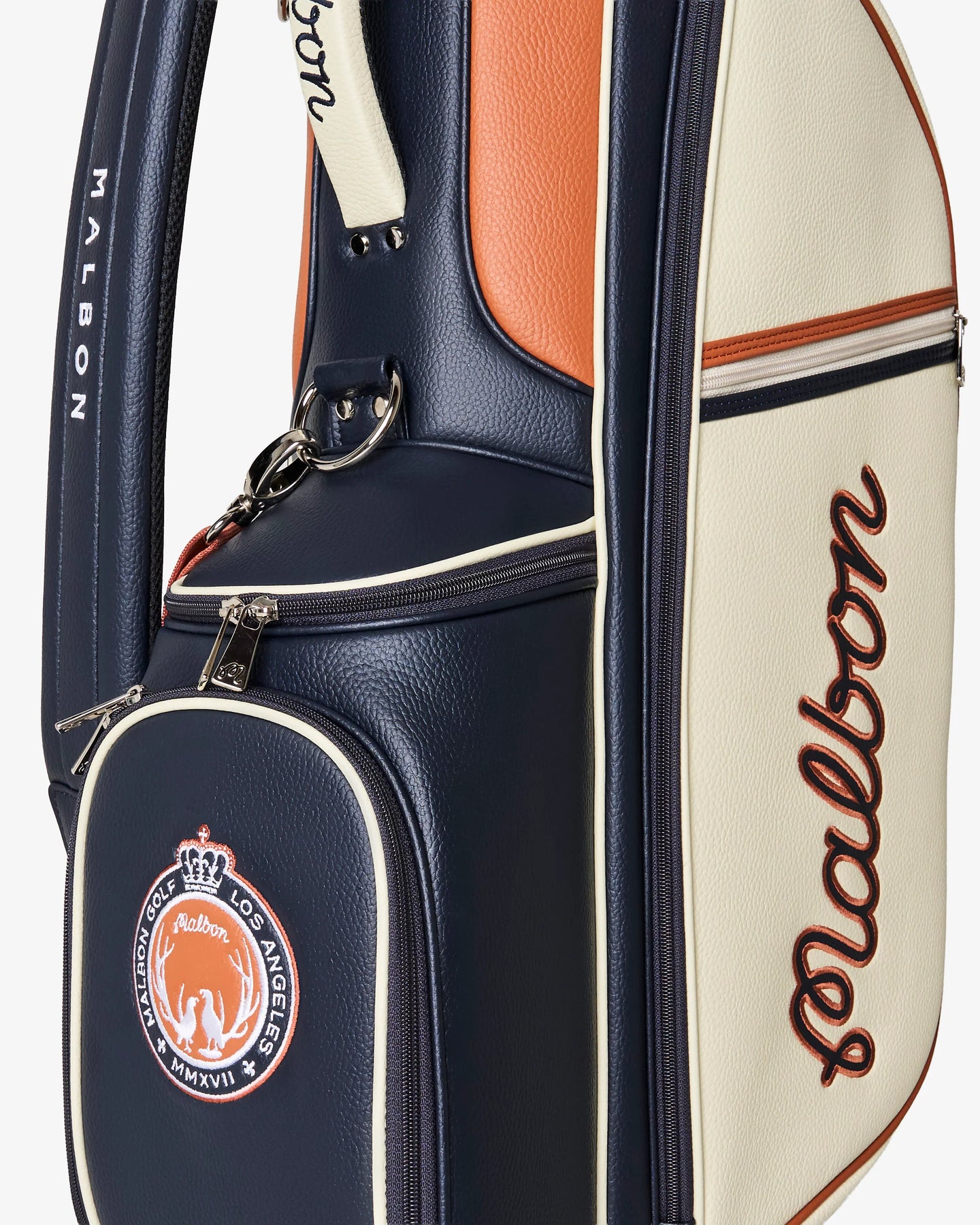 Showcasing signature colors and embroidery from FW25, our Maxwell Golf Bag is crafted from durable PU textured leather, ensuring it can handle all your adventures on the course. It features multiple zippered pockets, including a convenient mesh rangefinder pocket and a magnetic closure pocket on the front for quick access to essentials. With a lightweight design—under six pounds—and cross back straps with clips, this golf bag provides maximum comfort for all-day rounds.