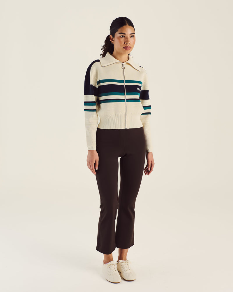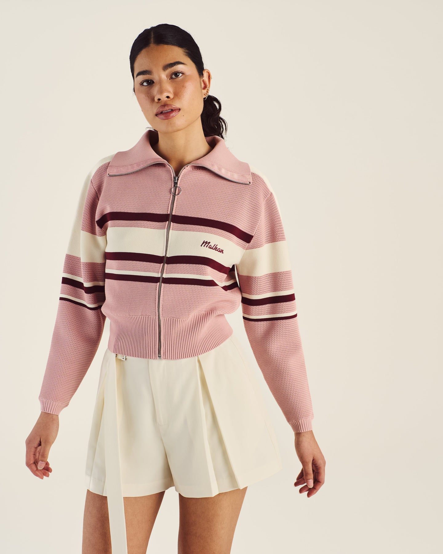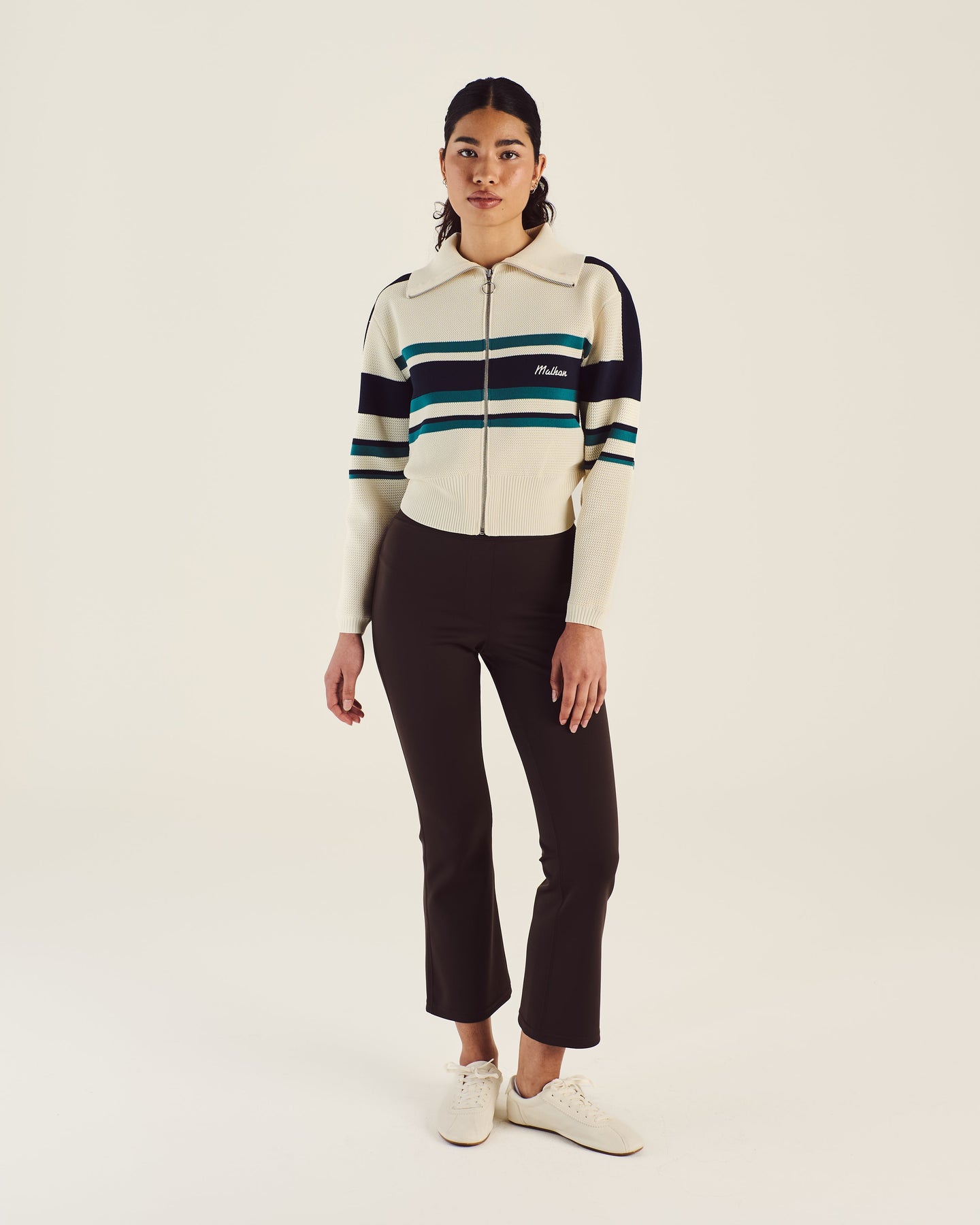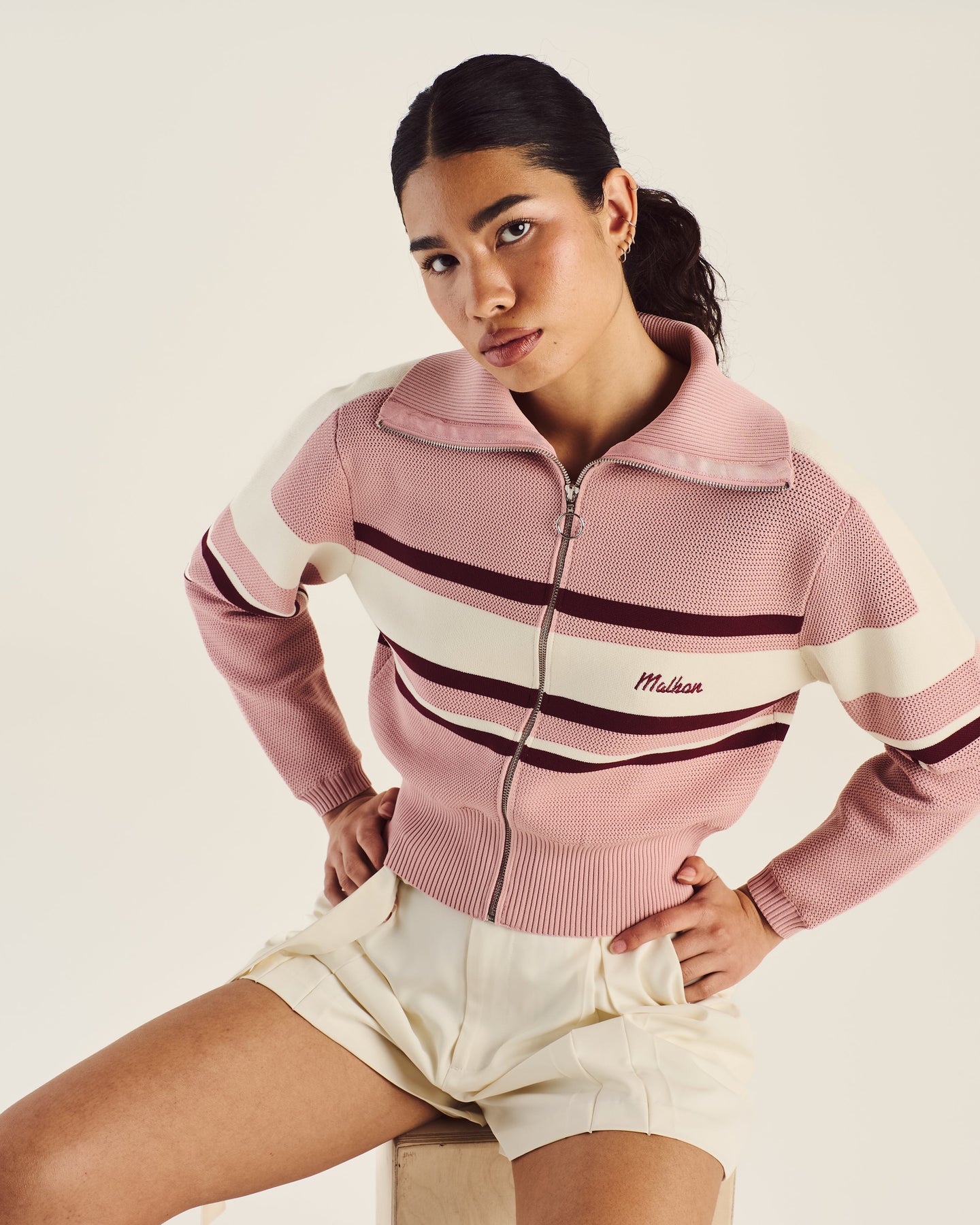 Effortlessly refined and built for versatility, the Malbon Golf Simona Zip Up Jacket blends polished athletic styling with functional design. Made from lightweight, durable polyester, this slightly cropped jacket features a breathable mesh lining for enhanced airflow. Ribbed detailing at the collar, cuffs, and waistband provides a flattering, tailored fit that moves with you throughout the day. Whether you're heading out for an early tee time or layering up for post-round plans, the Simona Jacket offers the perfect balance of performance and style. Finished with an embroidered Malbon logo on the left chest for a subtle, signature touch.