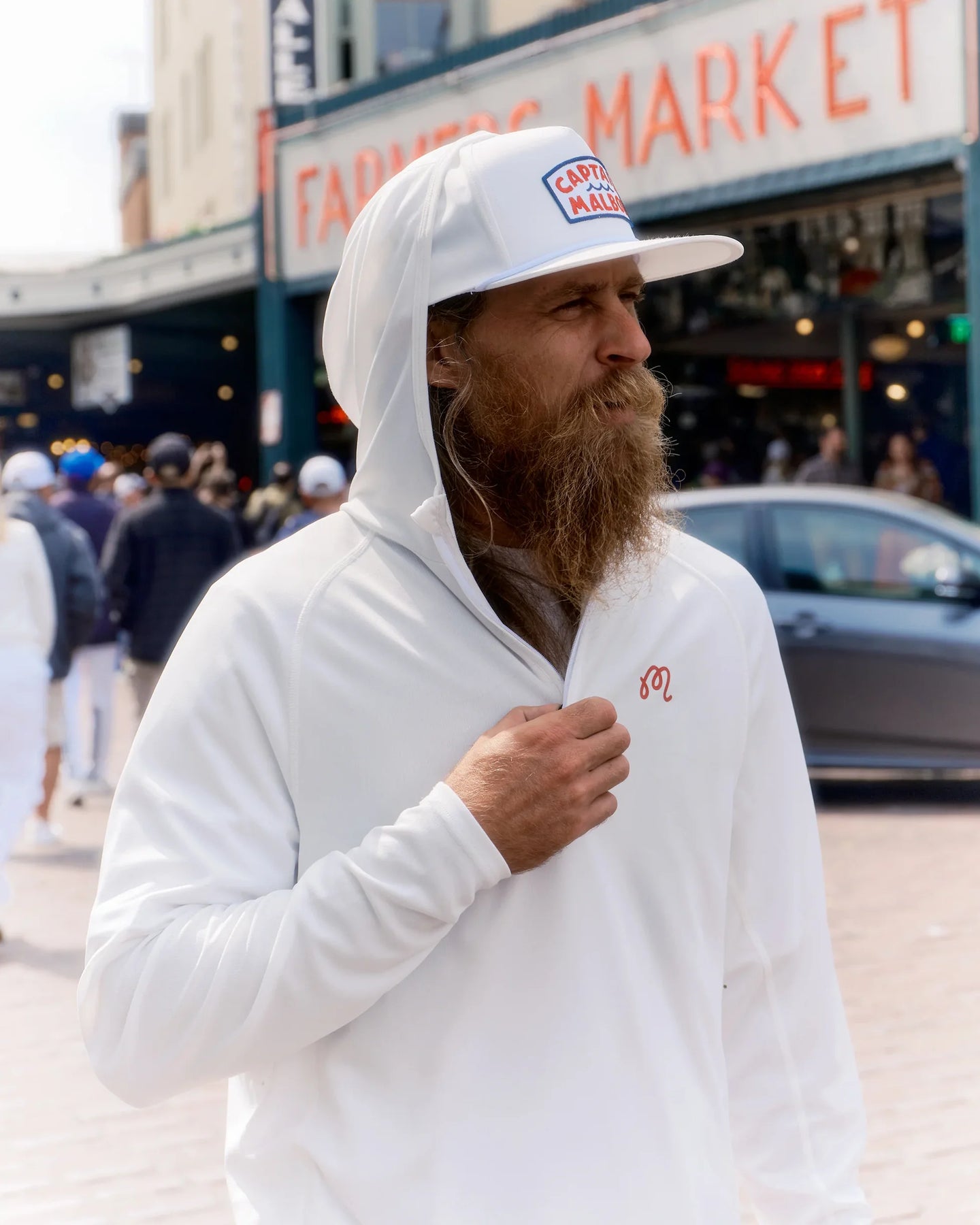 - Printed M script logo on left chest