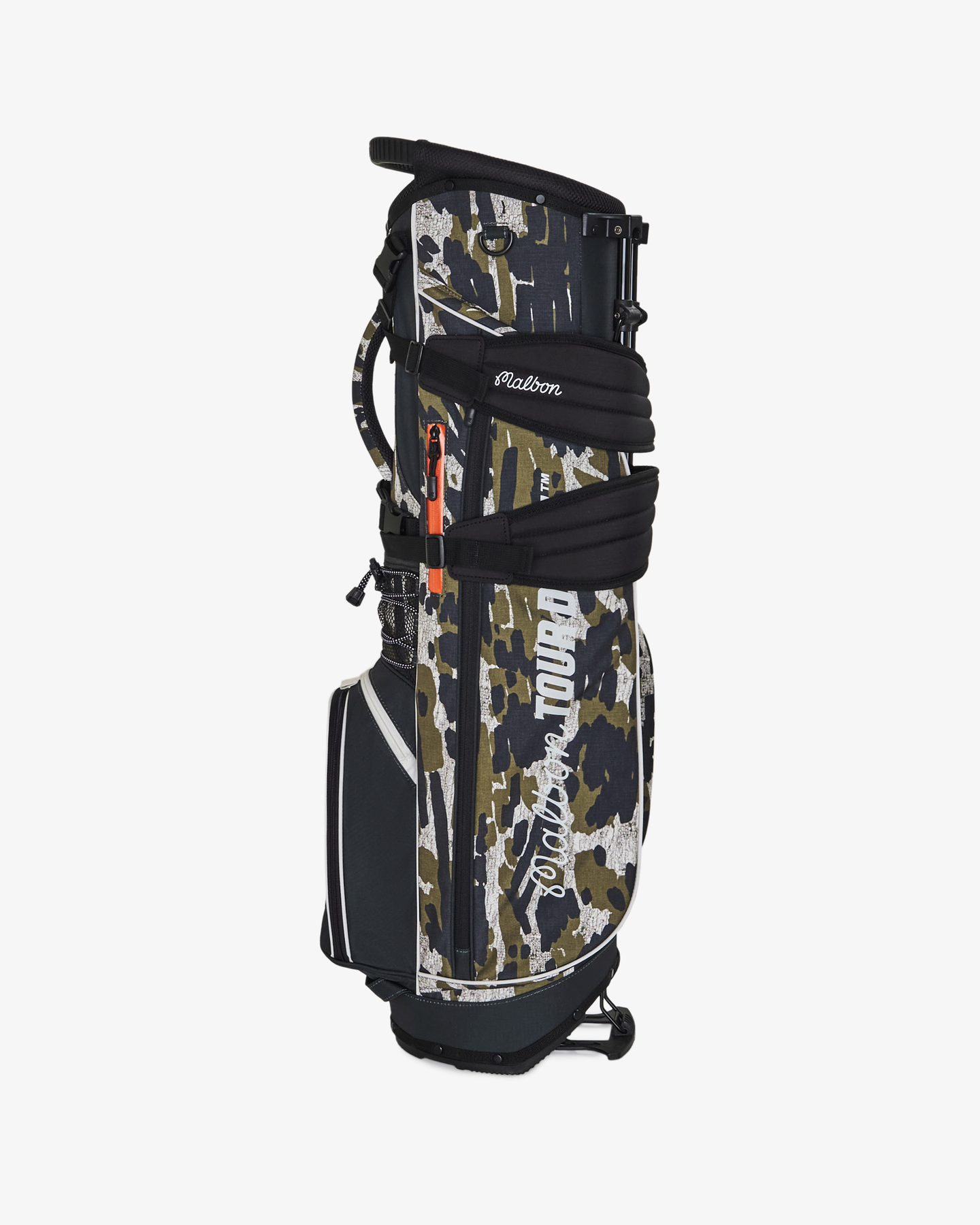 Showcasing an all-over camouflage—an original print from Tour Divot—the Walking Bag is crafted from durable nylon ripstop fabric, ensuring it can handle all your adventures on the course. It features multiple zippered compartments, including a convenient lined media pocket and a magnetic closure pocket on the front for quick access to essentials. With detachable cross back straps, this golf bag provides maximum comfort for all day rounds.