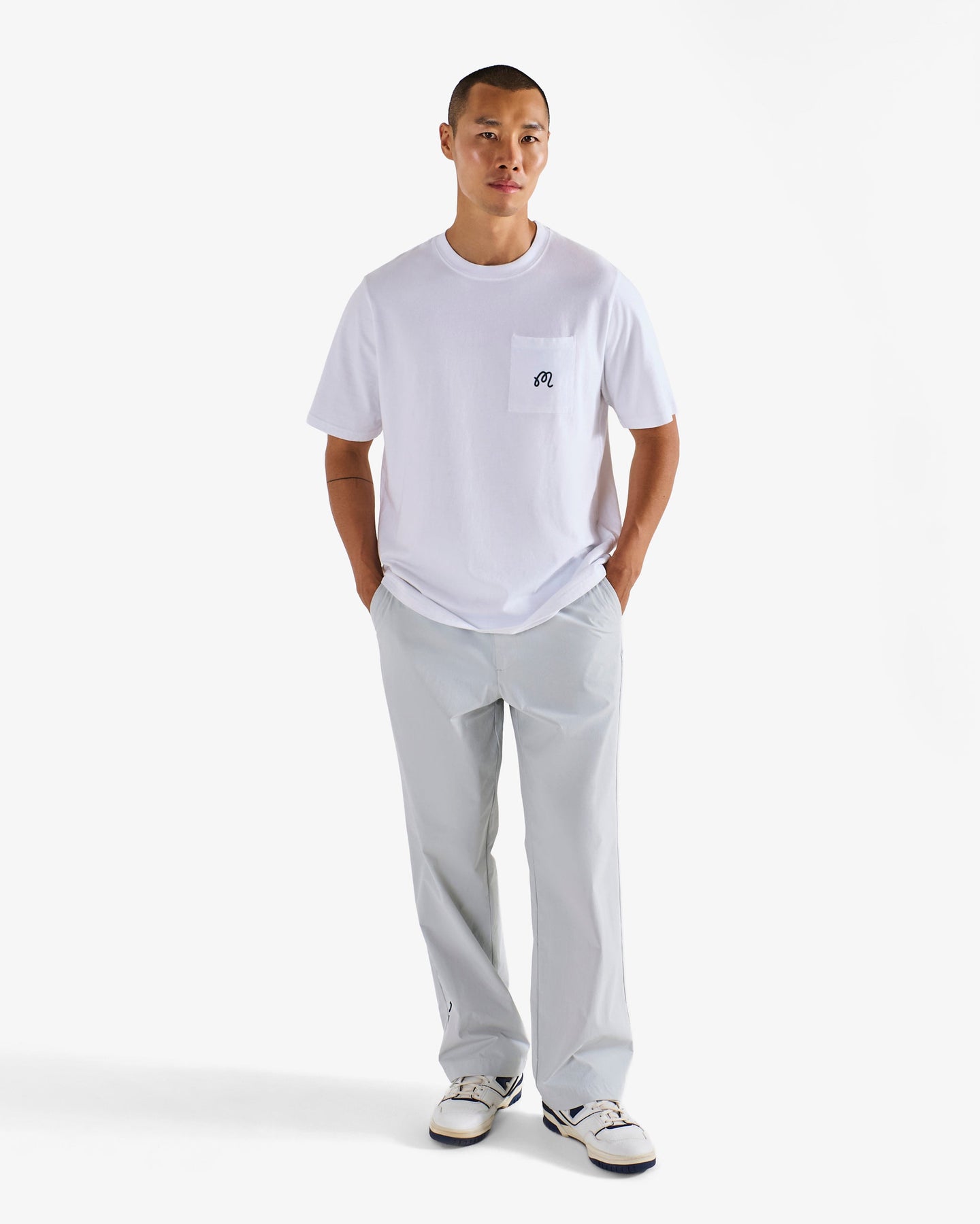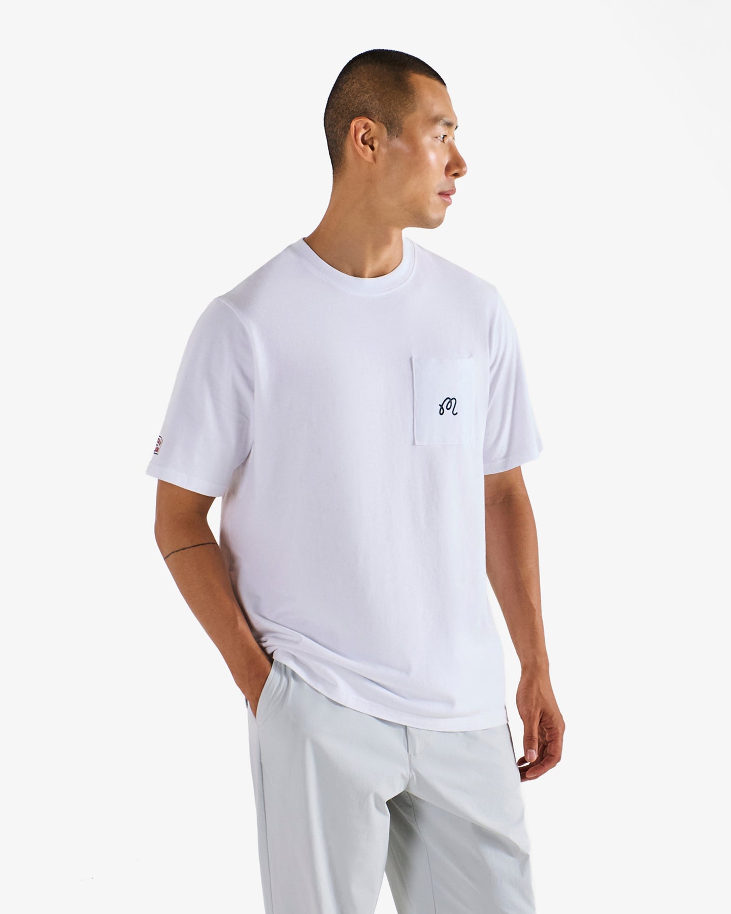 - Printed M script logo on left chest pocket
